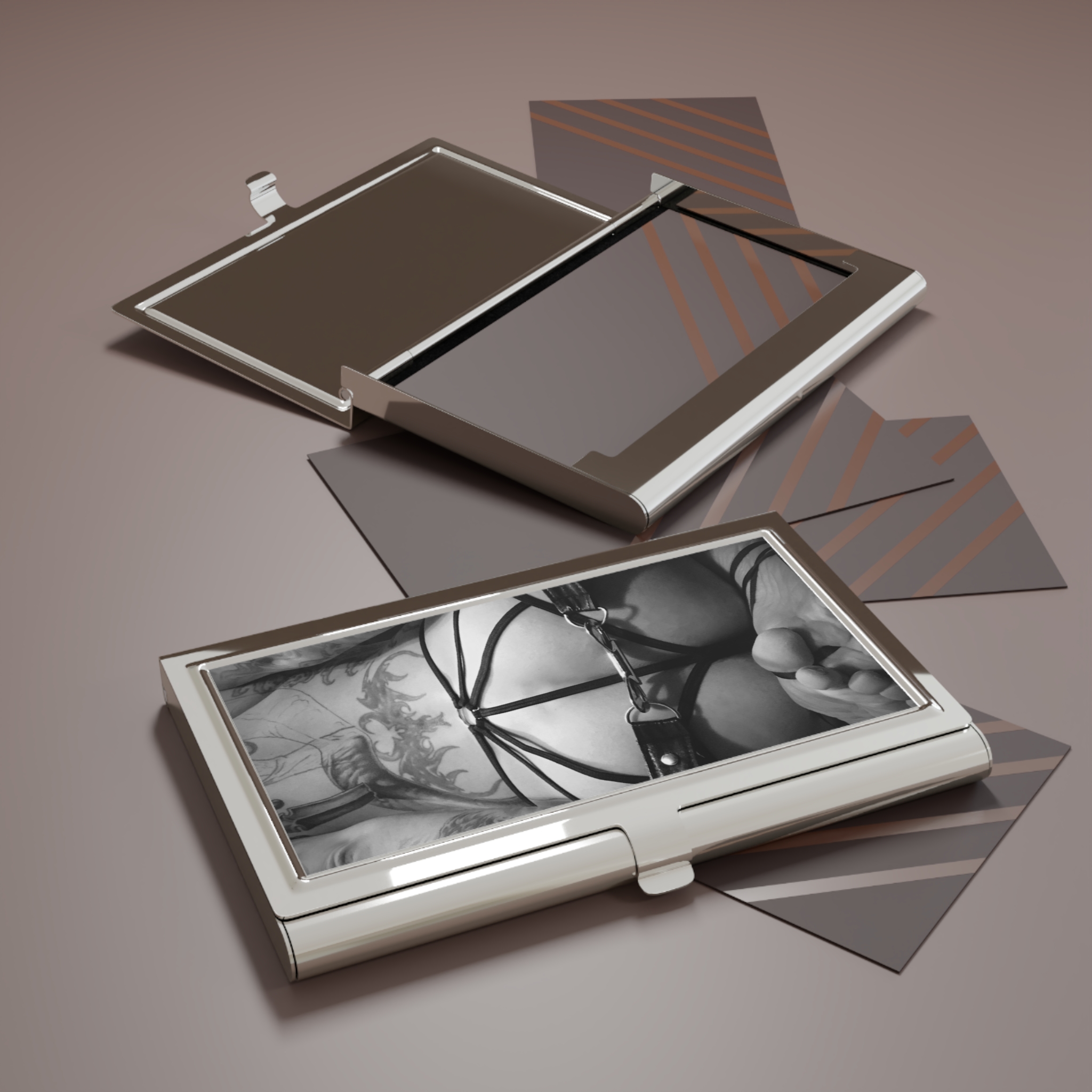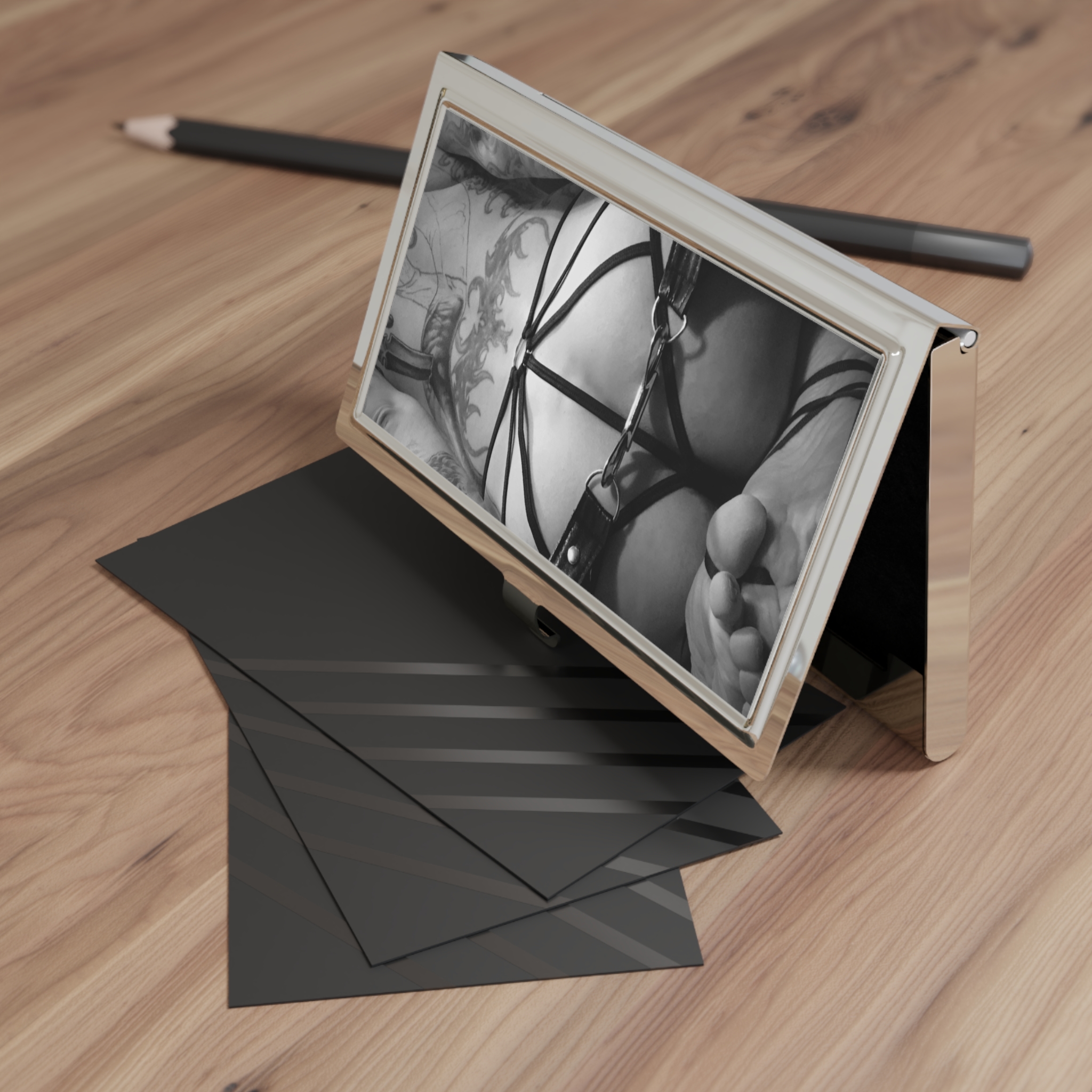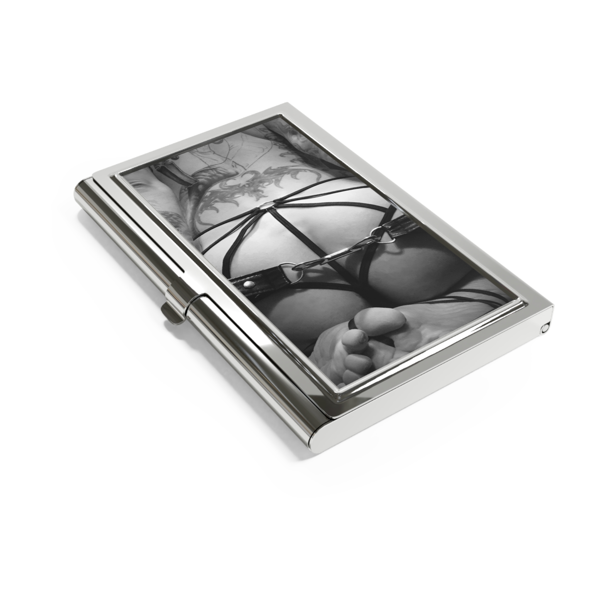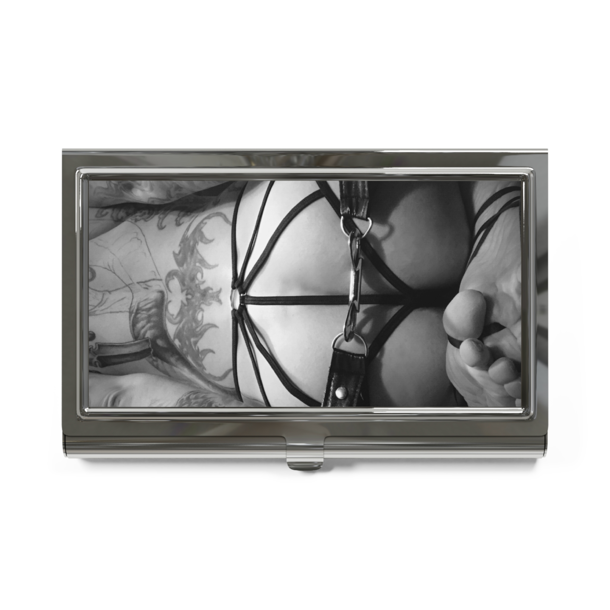 “The Punishment” business card holder. Comes complete with a sleek polished metal surface, a velvet-like interior storage base, and a capacity to store up to 20 cards.