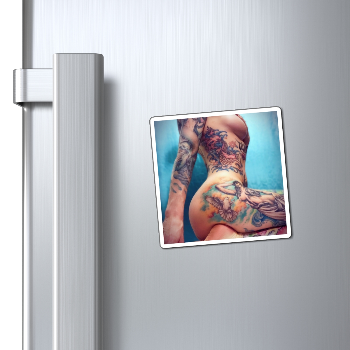 “Falling Into Grace” on white vinyl with black magnetic backing. 3″ x 3″ with a matte finish. Thin and lightweight – intended for indoor use.